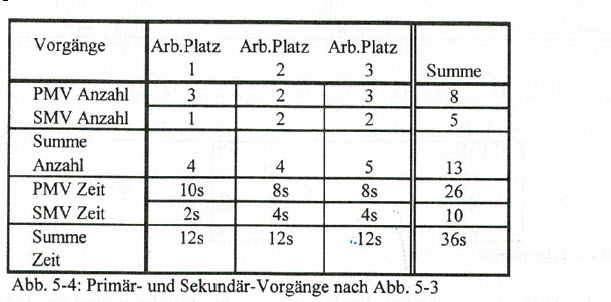 n Produkt, bestehend aus acht Einzelteilen, wird in einer Anordnung gemäß ABB. 5-3, an drei manuellen Montagearbeitsplätzen montiert. Am Montagearbeitsplatz 1 wird das Basisteil der zu montierenden Baugruppe vom Arbeitenden gegriffen und in die Fügeposition gebracht. Zwei weitere Teile werden gefügt. Diese Vorgänge fallen unter Primäraufwand. Das Ablegen der am Arbeitsplatz 1 gefügten Vormontagegruppen auf den Zwischenpuffer (ZP1) dagegen ist ein sekundärer Vorgang, da er nicht der unmittelbaren Erzeugung des Kundennutzens dient, jedoch aufgrund der gewählten Organisationsform notwendig ist.
